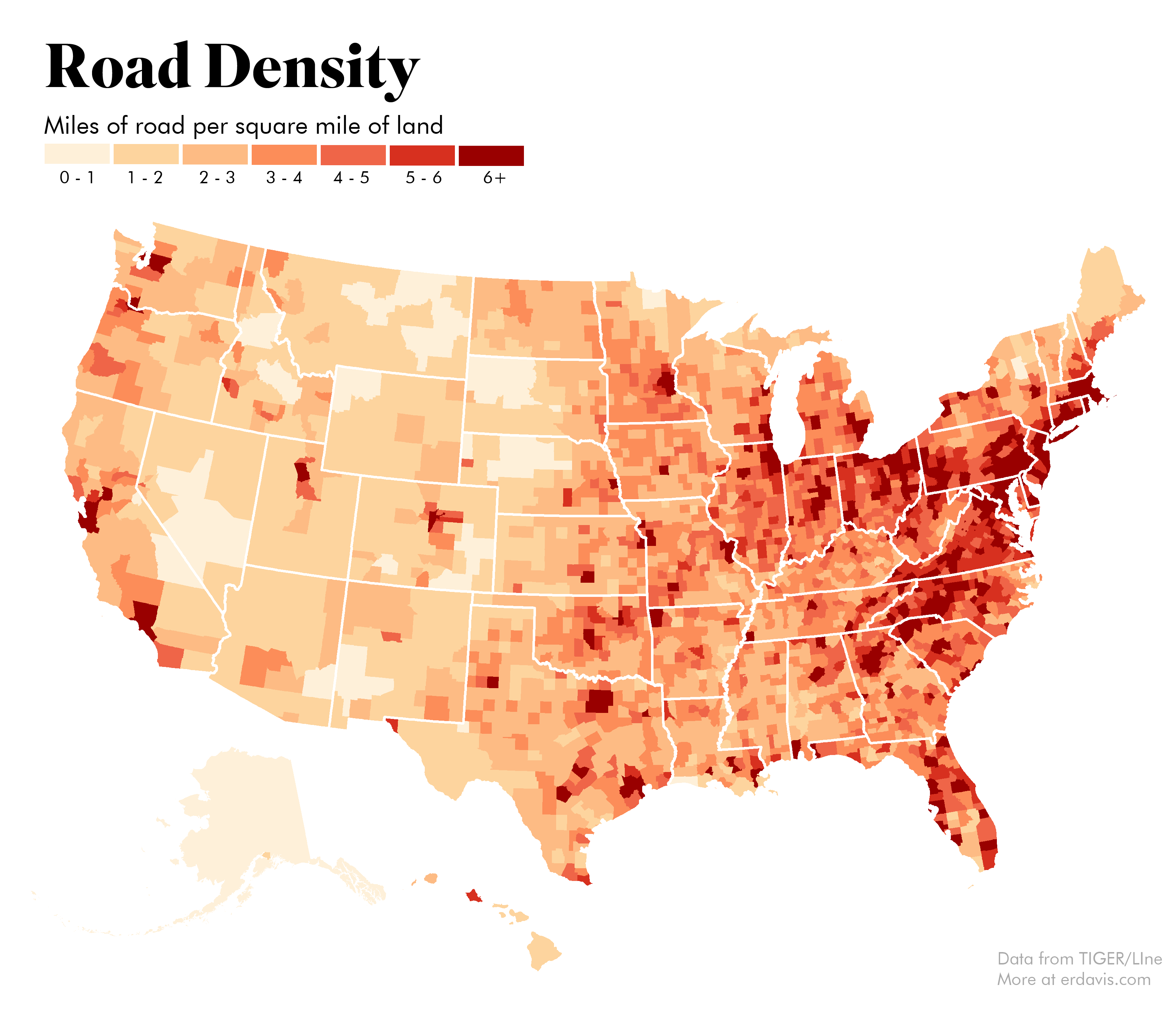 One thing that did come out of the Reddit post, however, was the idea to map by miles of road, not by raw number of roads. I liked this idea, but didn’t know how to implement it for quite a while.