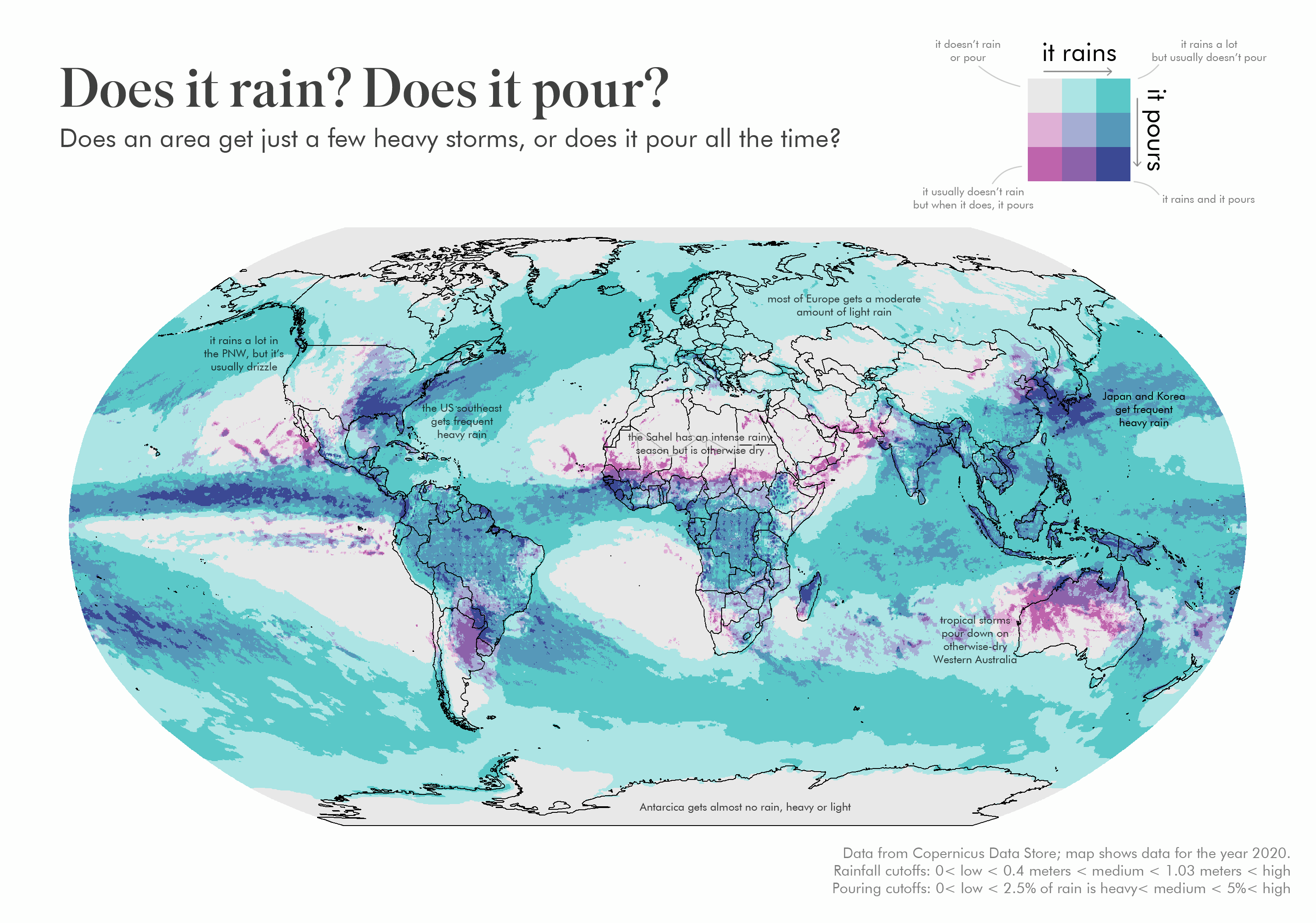 In essence, this map shows that areas that receive heavy rain don’t necessarily receive a lot of it. And areas that receive a lot of rain don’t necessarily receive heavy rain.