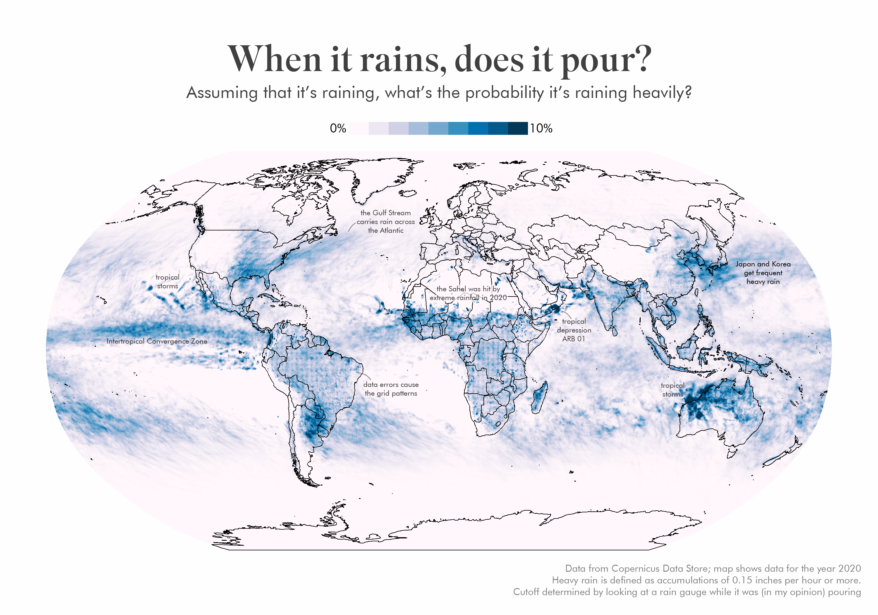 The data shown comes from the Copernicus Climate Data Store, which provides global hourly rainfall at a fairly detailed resolution. I only mapped data for the year 2020, when if ever it rained, it poured.