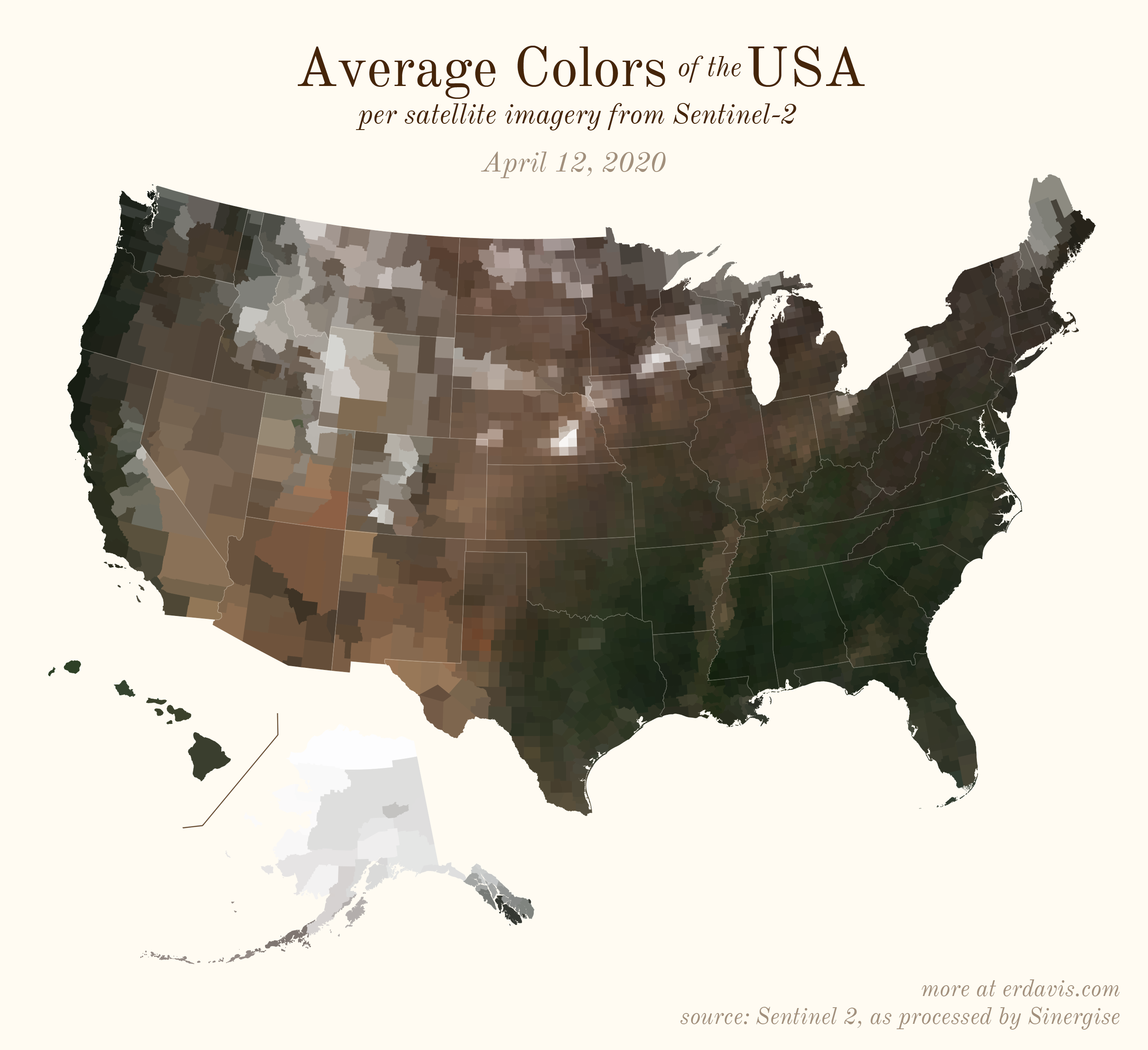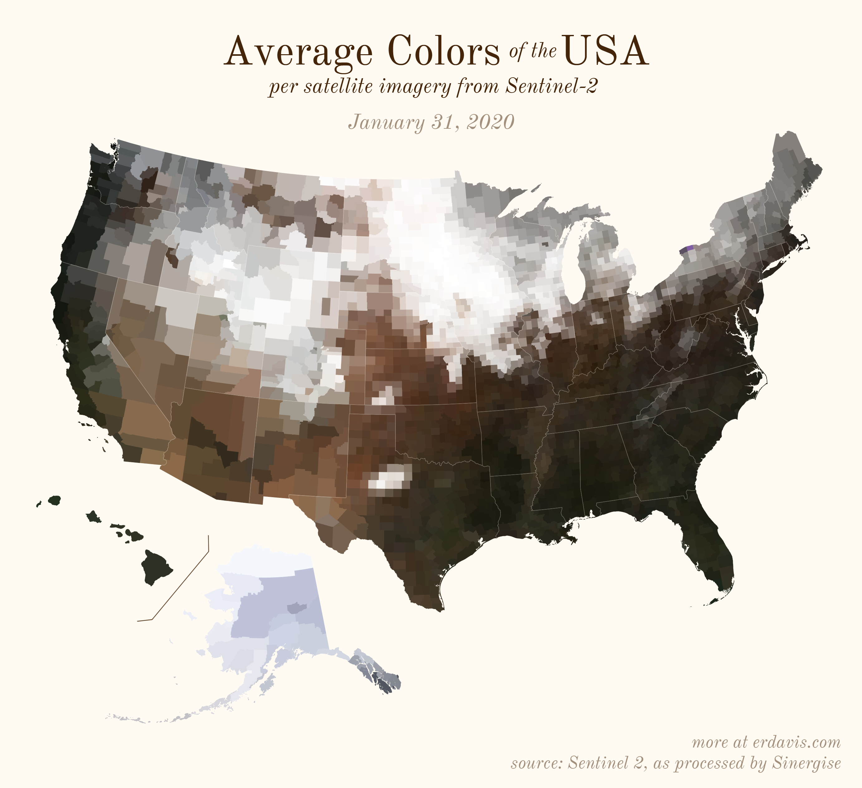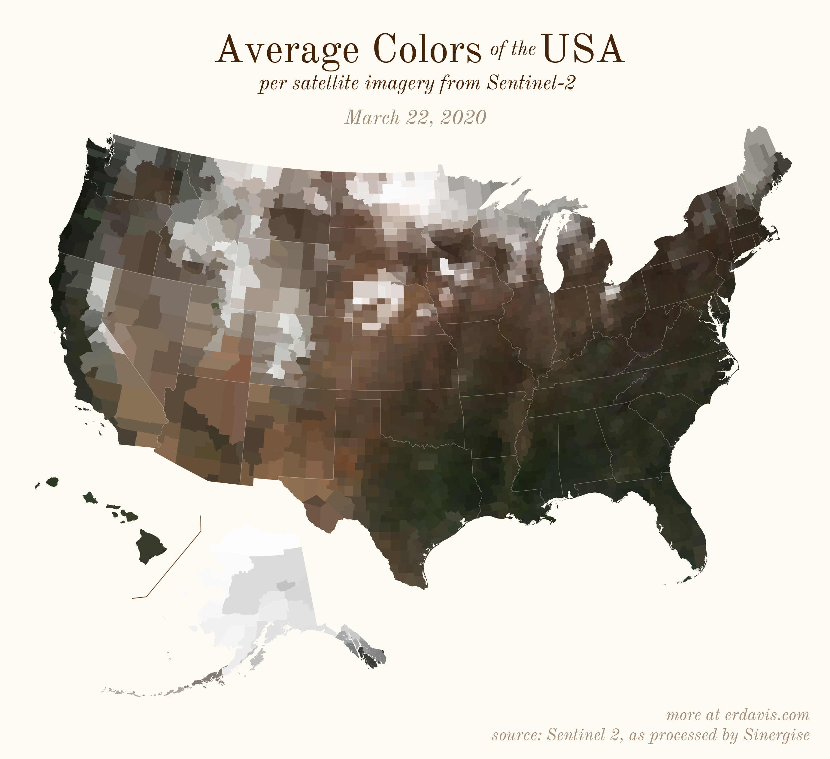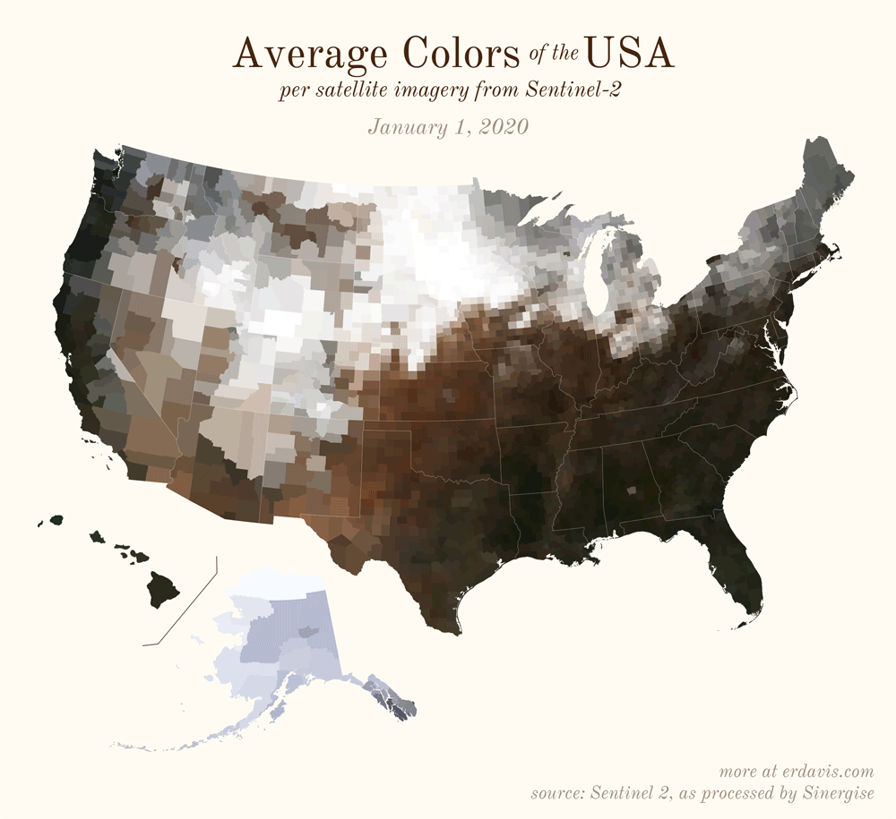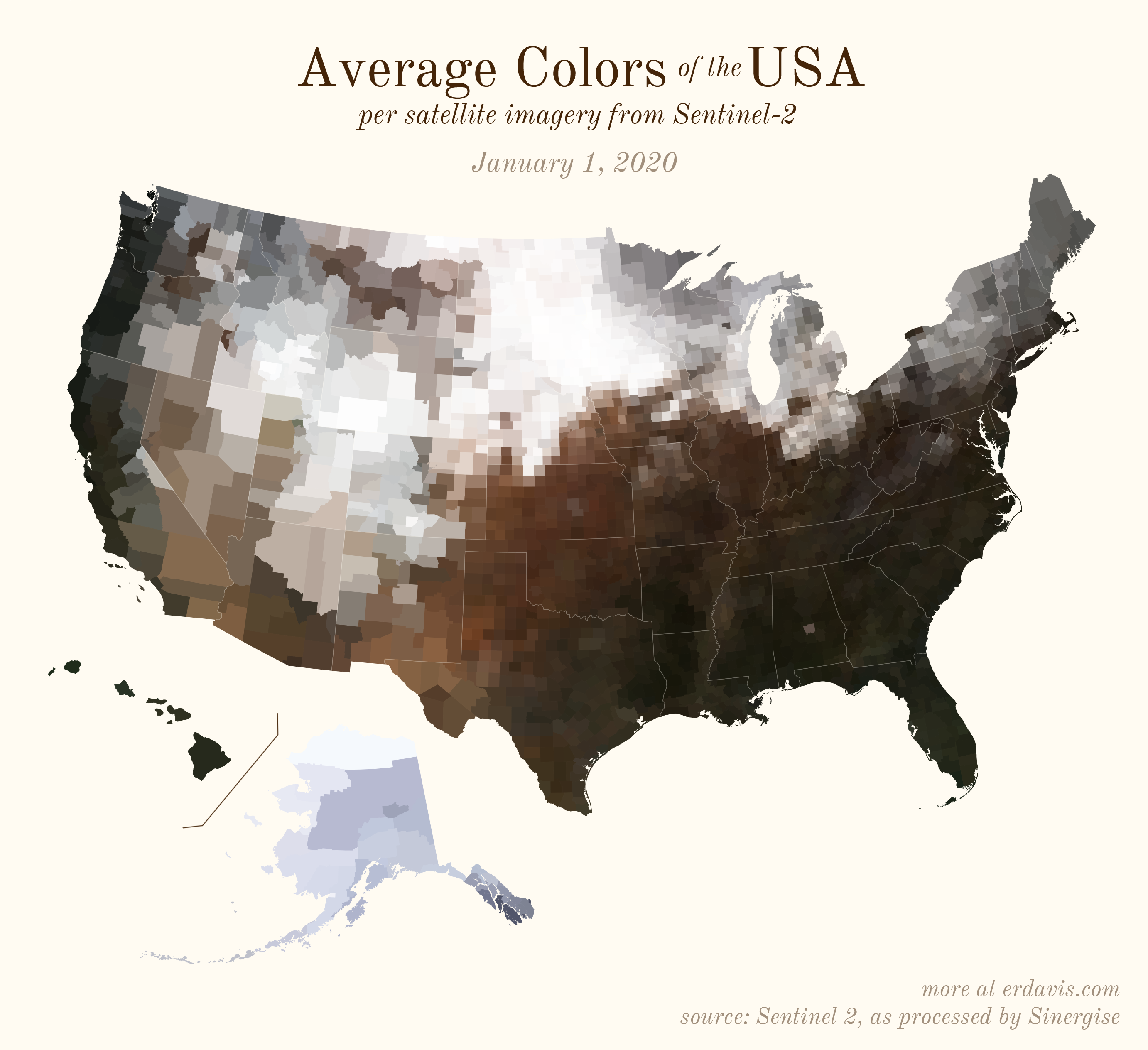 […] the first day of 2020 (as derived from Sentinel 2 satellite imagery). If you visit Erin's post the Average Seasonal Color of the USA you can view 35 other maps showing how the average colors of the USA change over the course of the […]