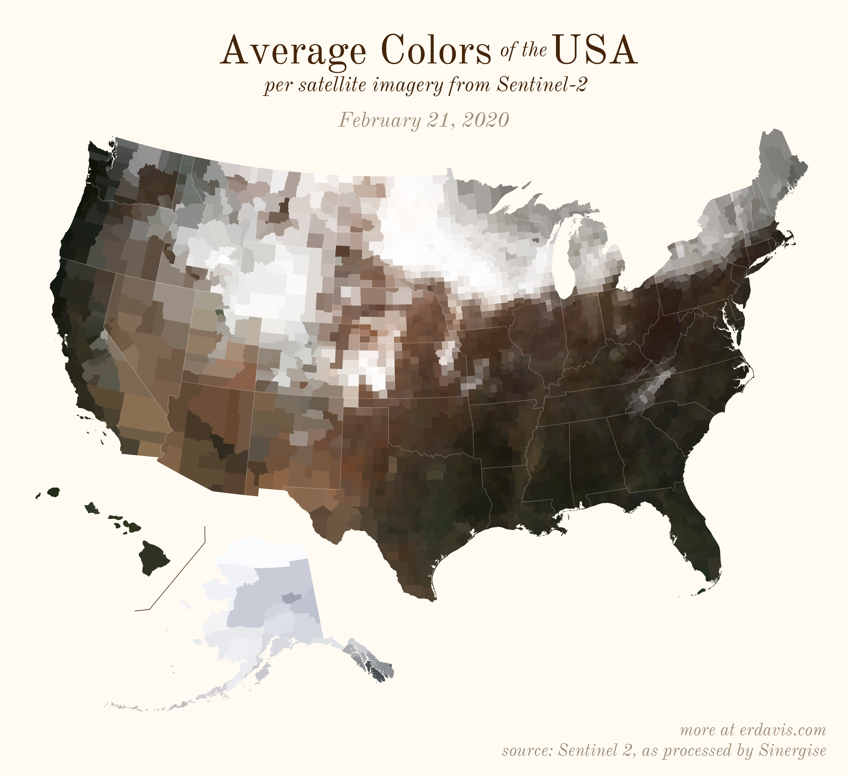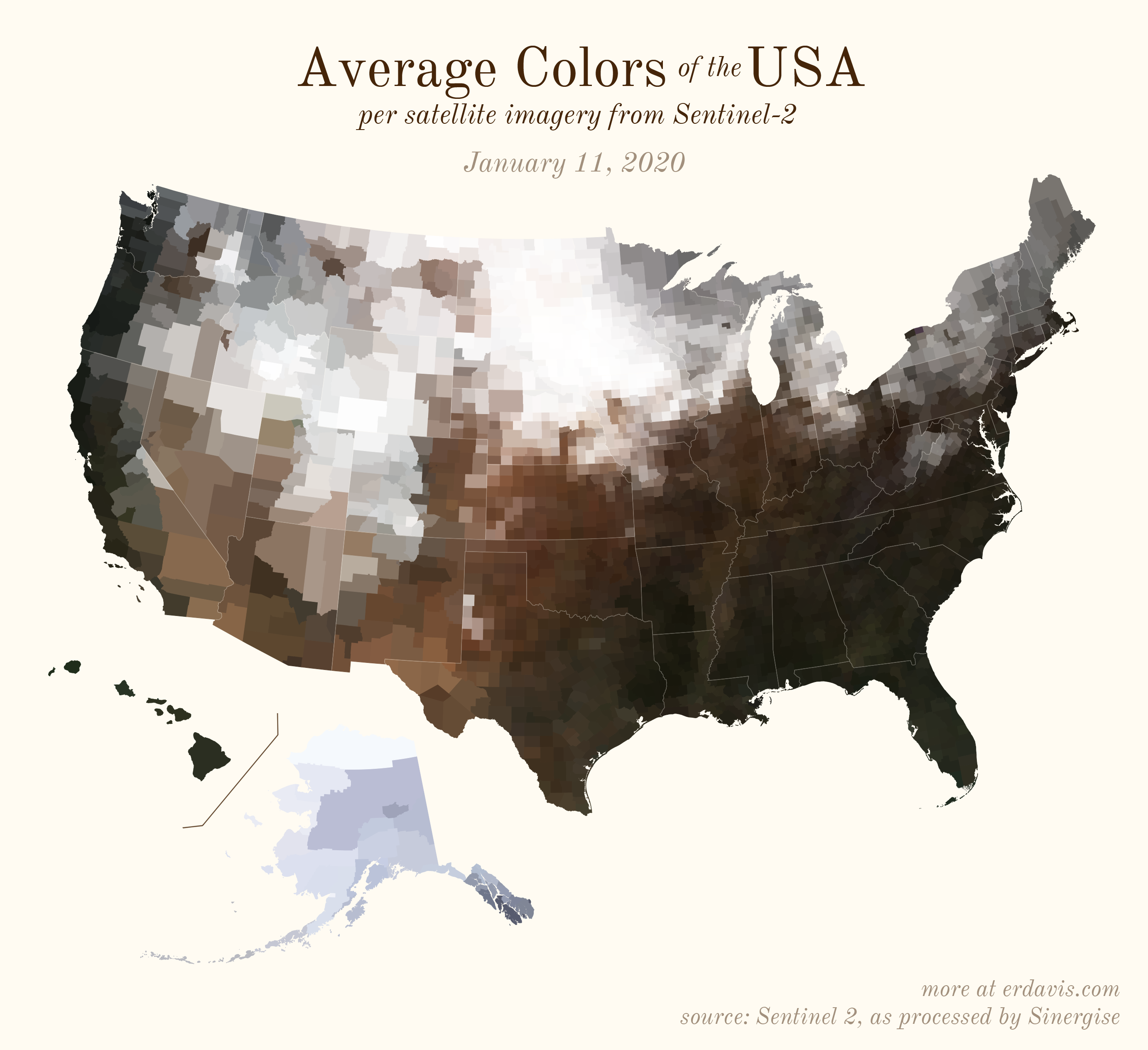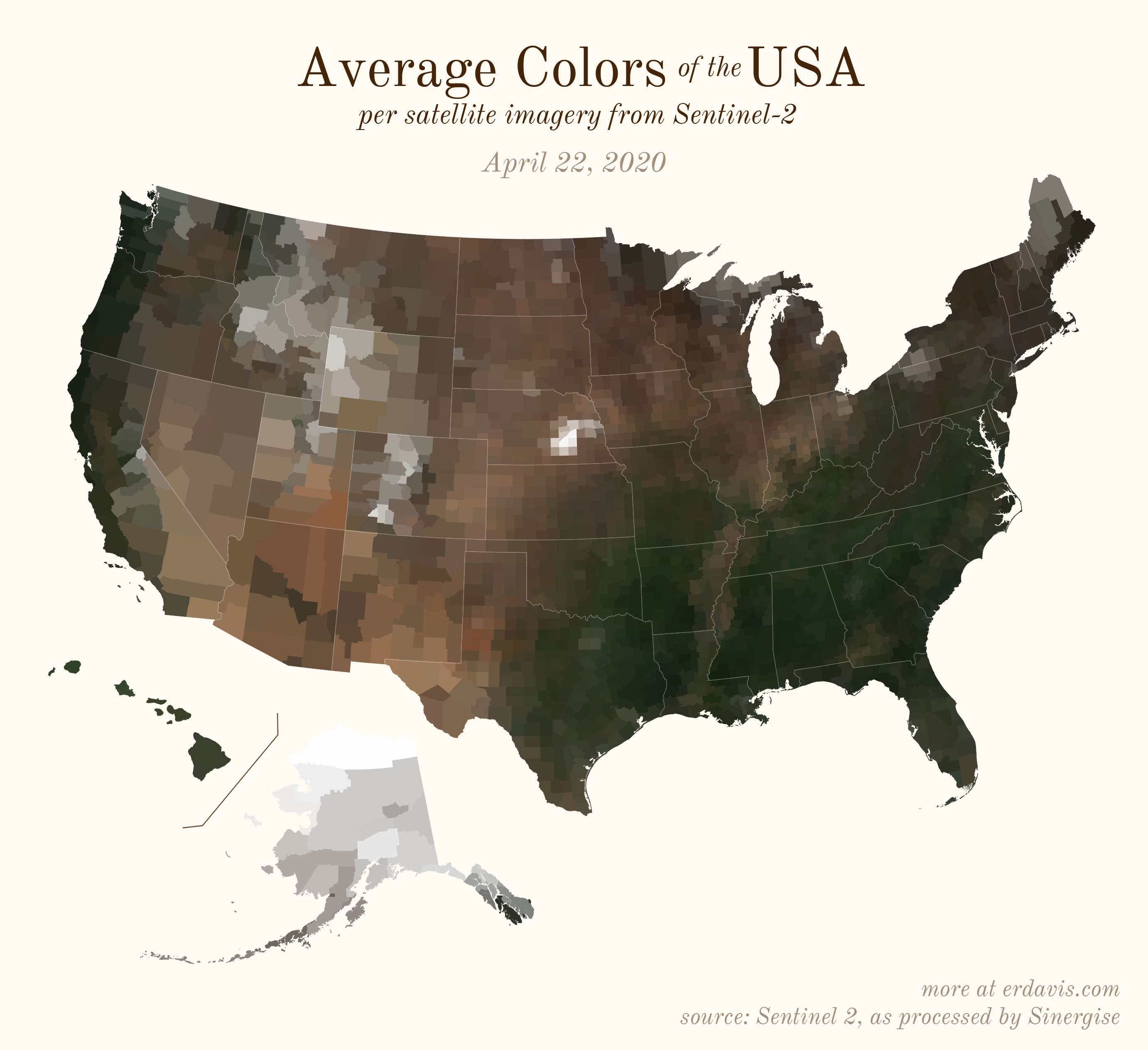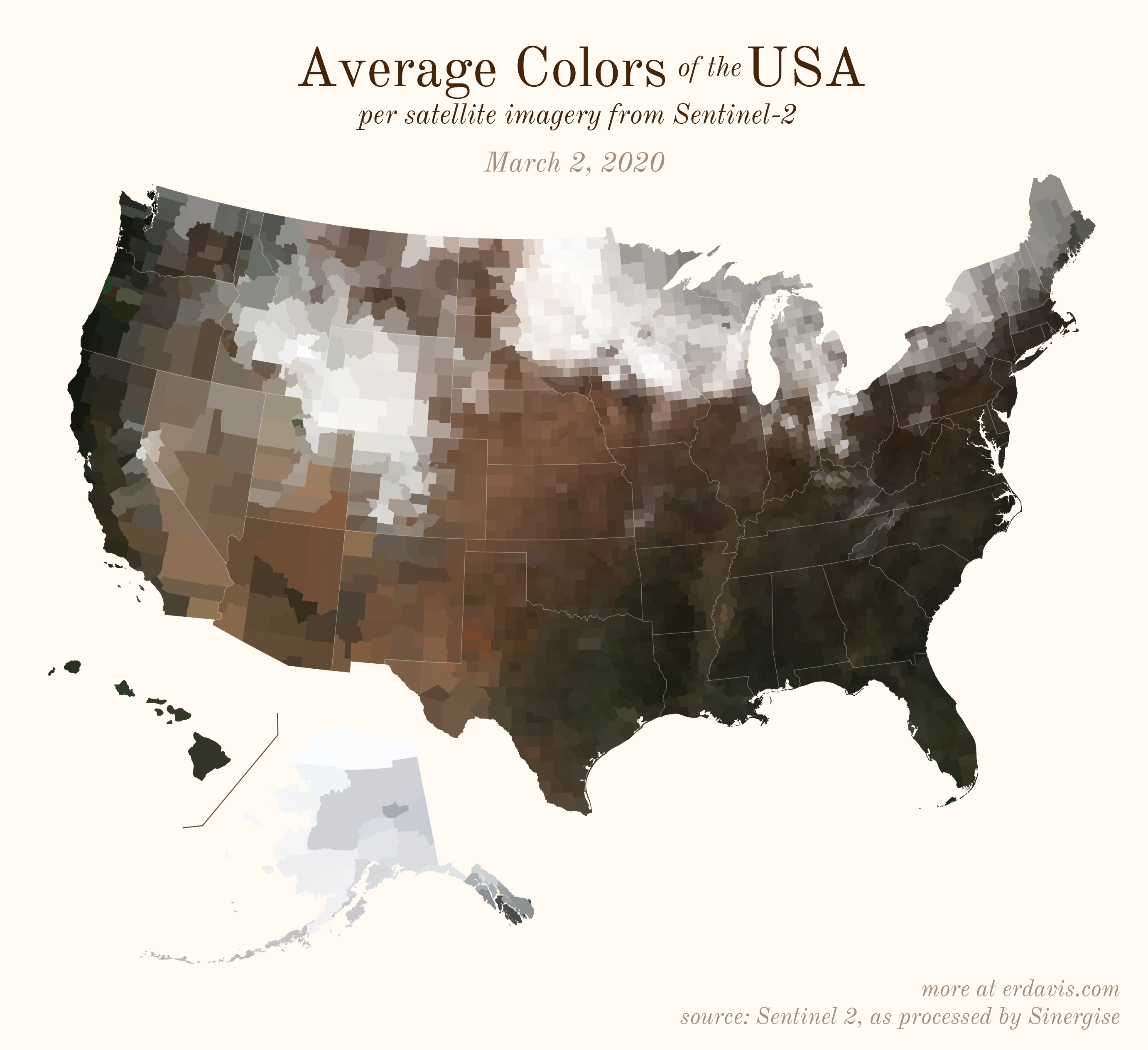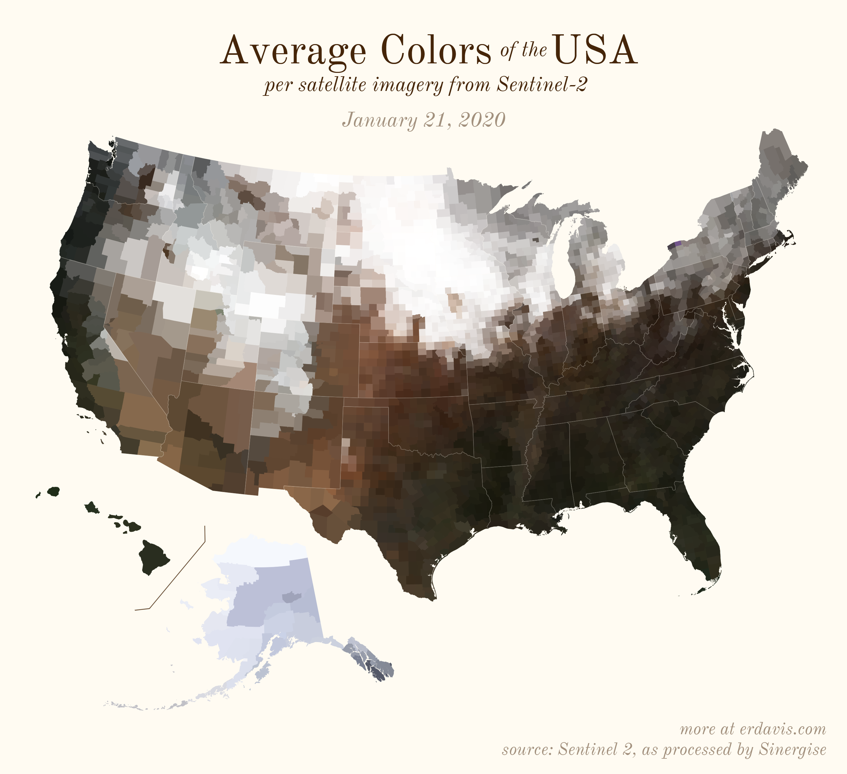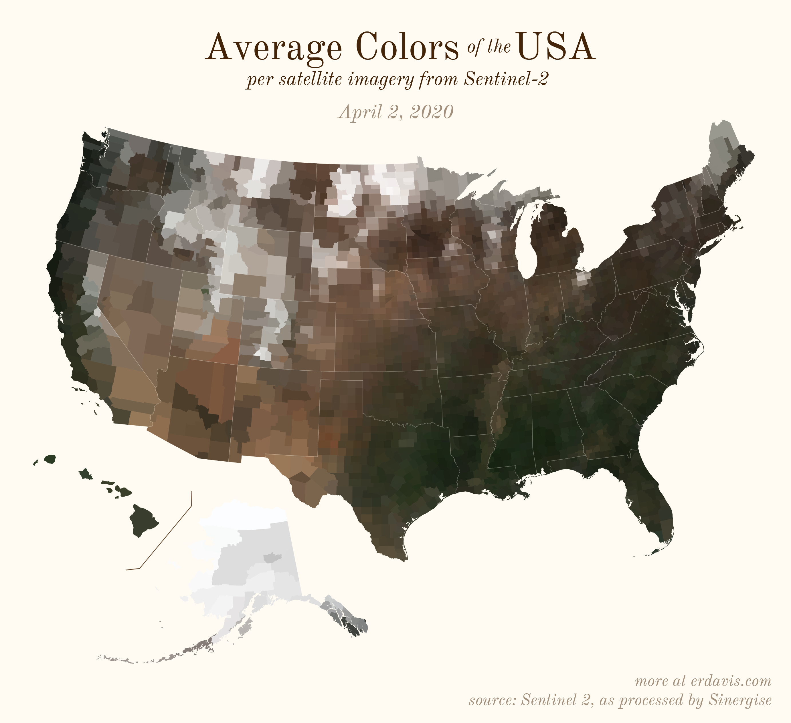 […] the first day of 2020 (as derived from Sentinel 2 satellite imagery). If you visit Erin's post the Average Seasonal Color of the USA you can view 35 other maps showing how the average colors of the USA change over the course of the […]
