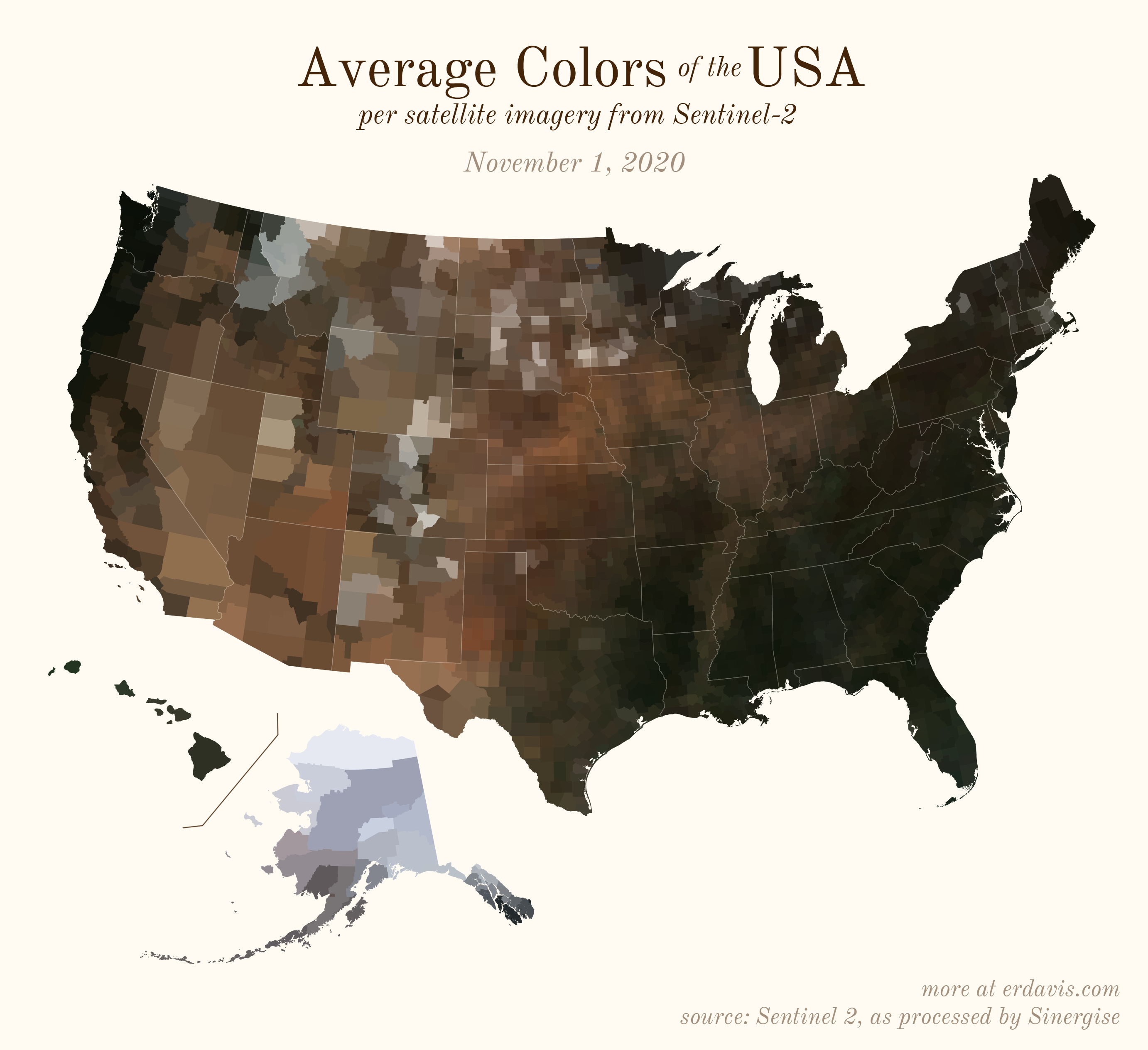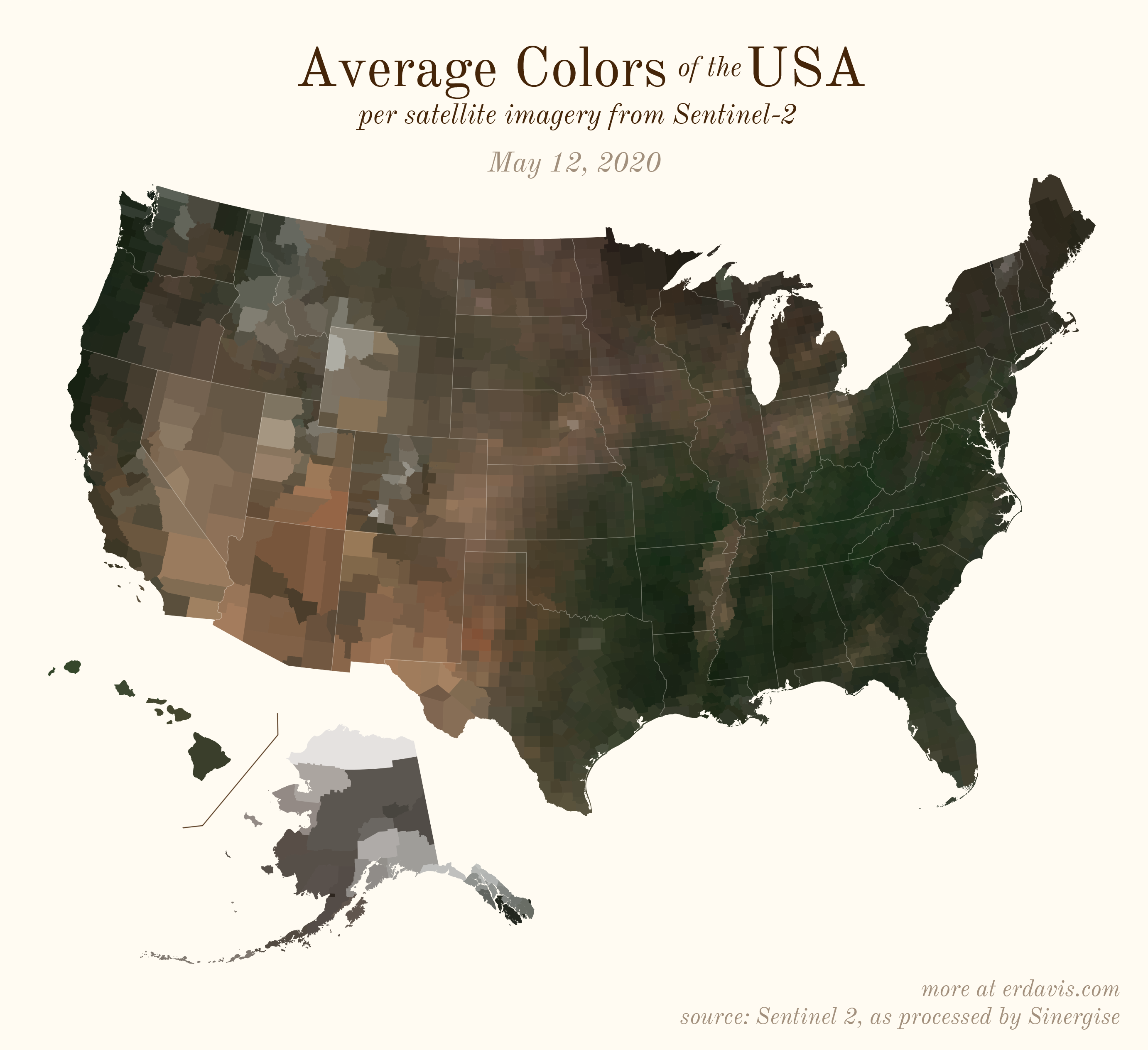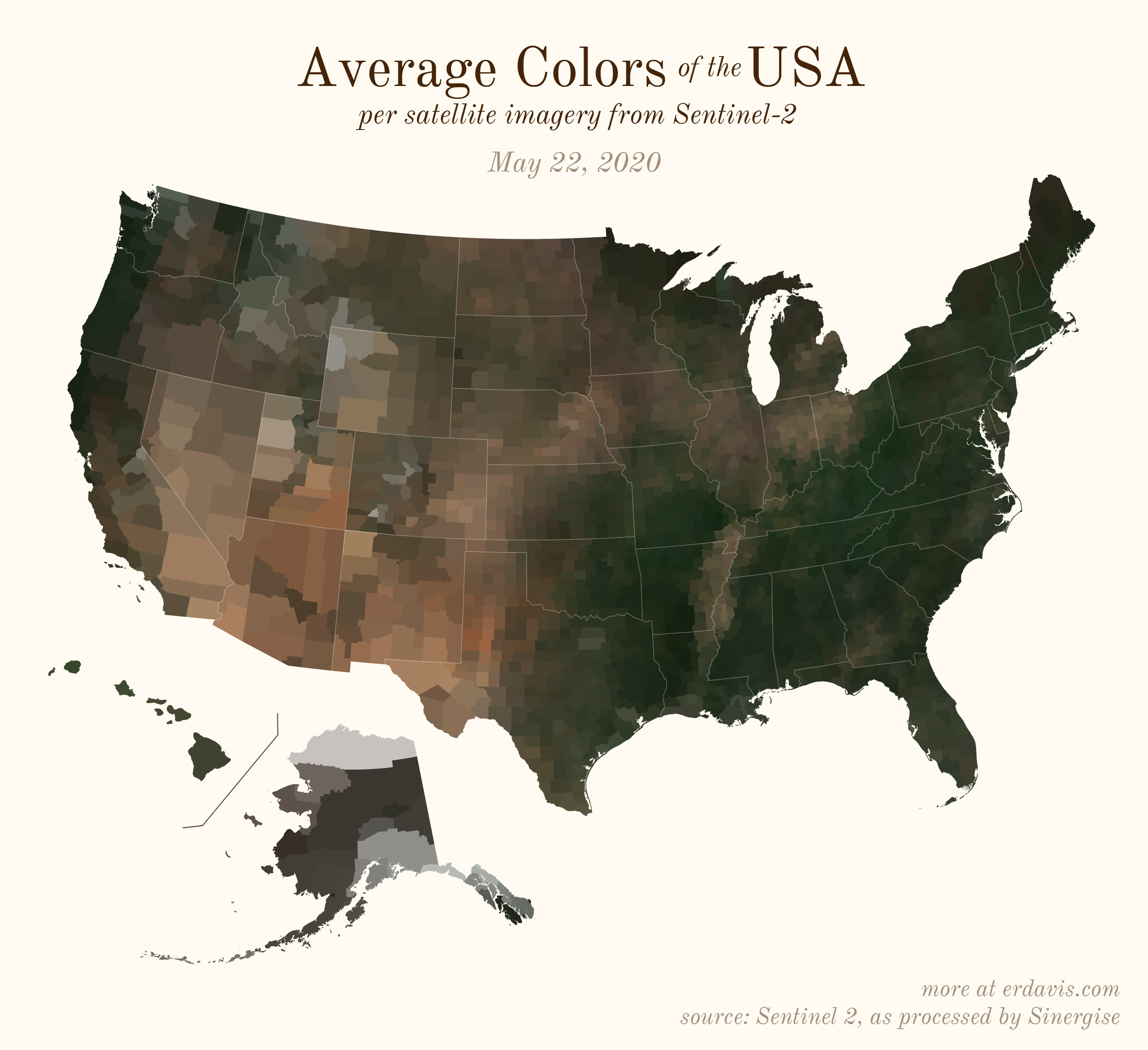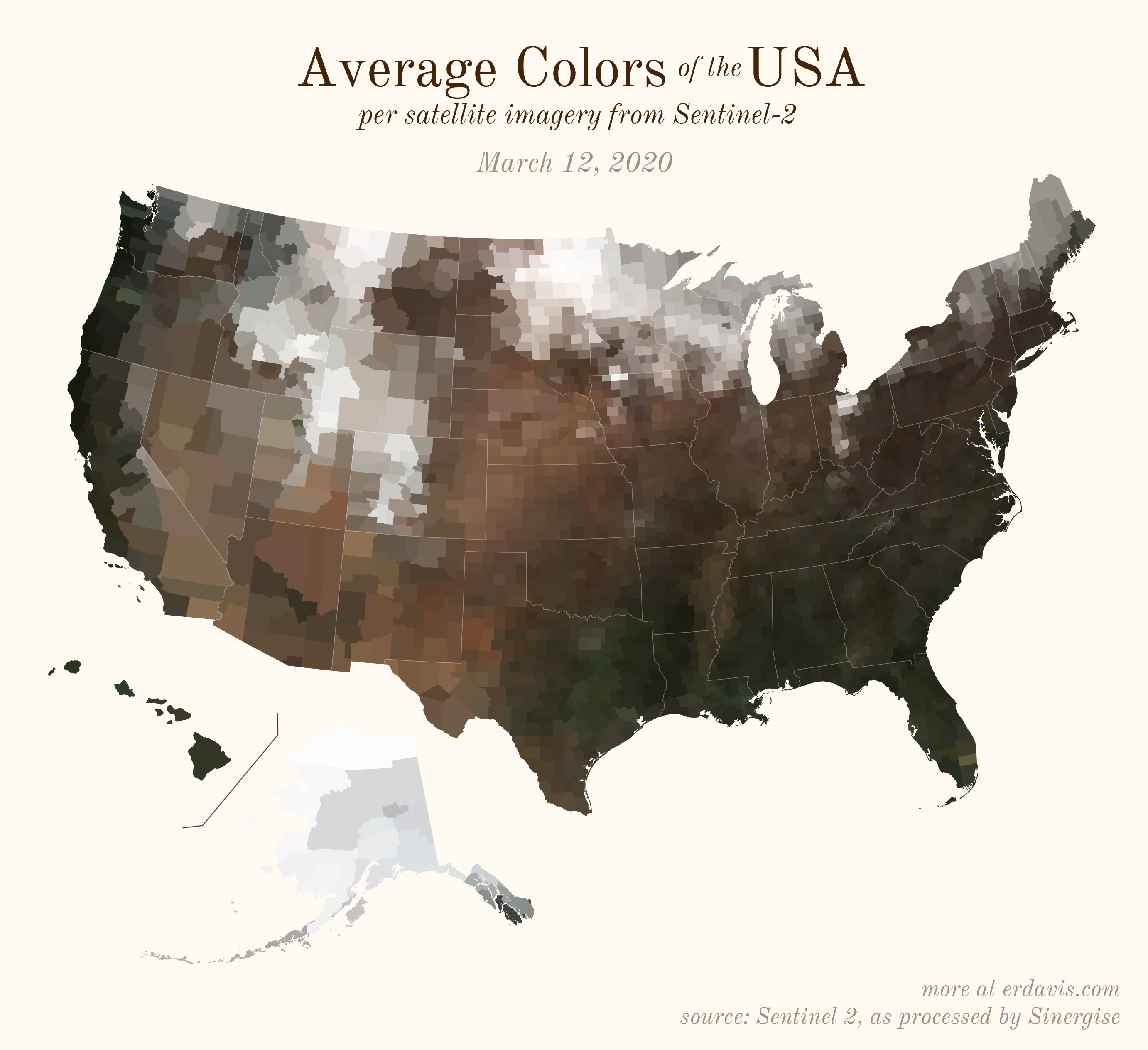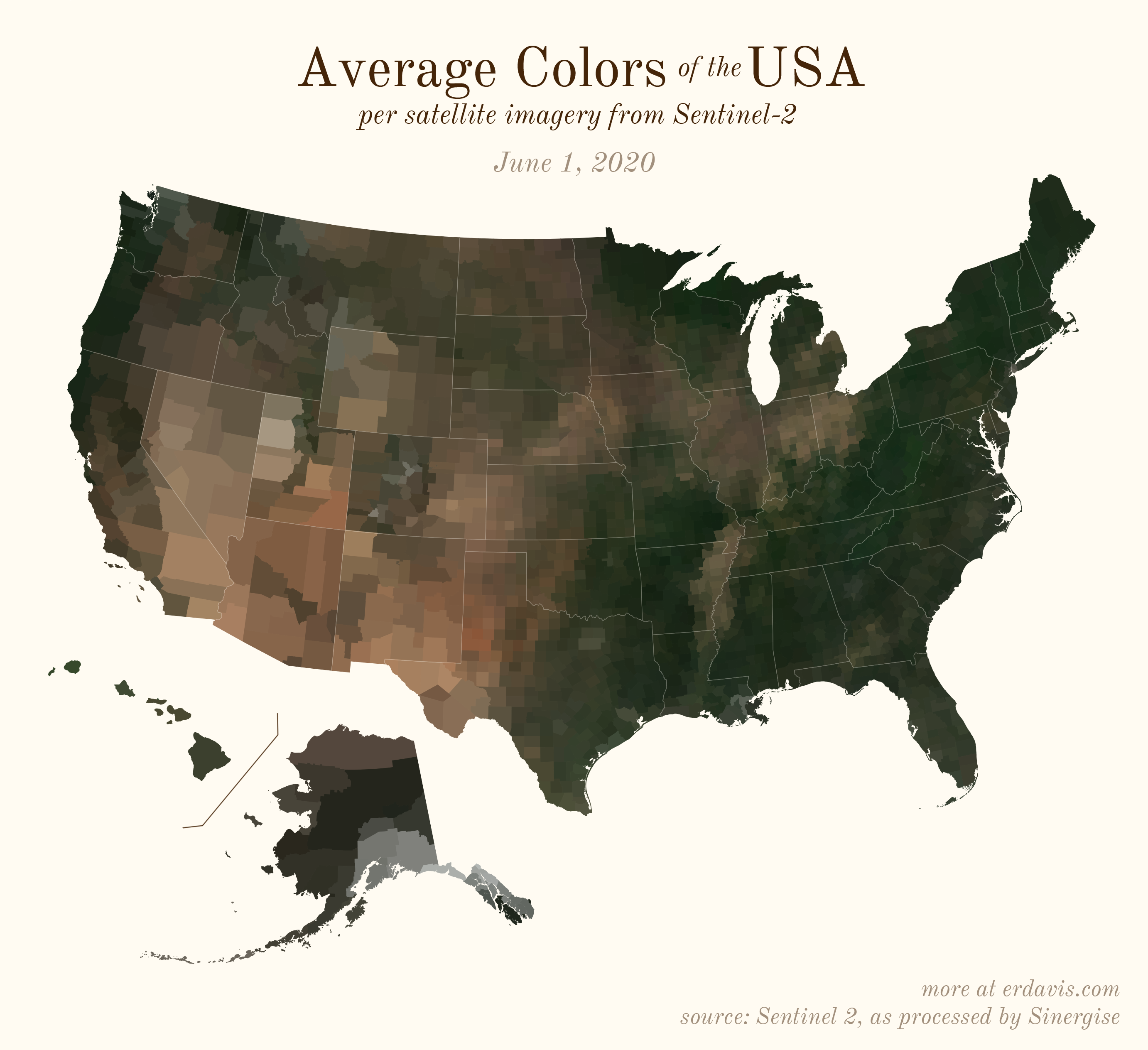 […] the first day of 2020 (as derived from Sentinel 2 satellite imagery). If you visit Erin's post the Average Seasonal Color of the USA you can view 35 other maps showing how the average colors of the USA change over the course of the […]