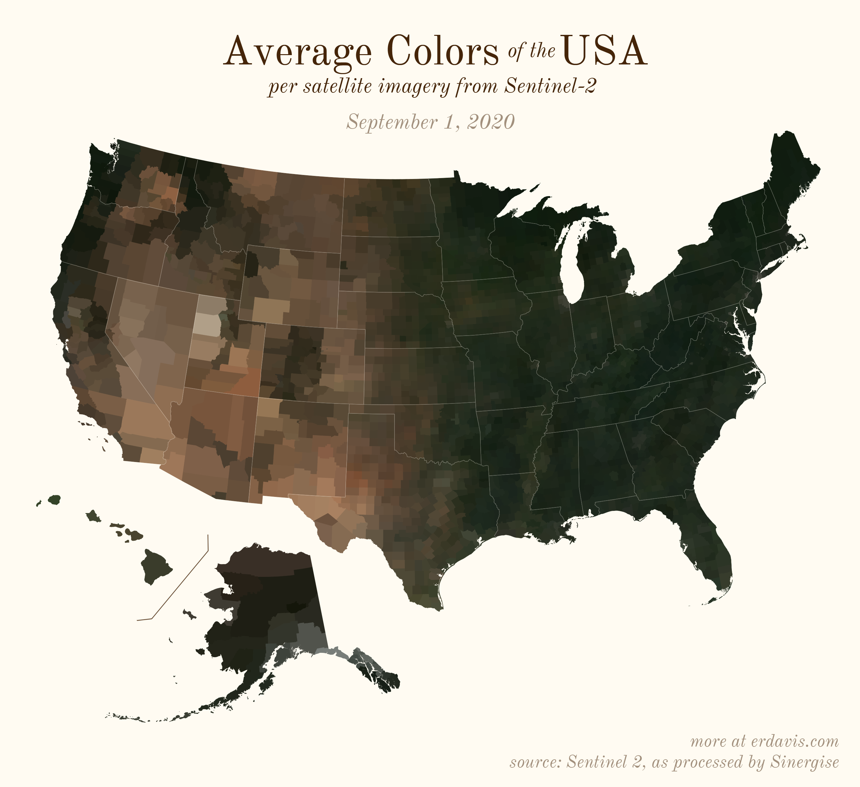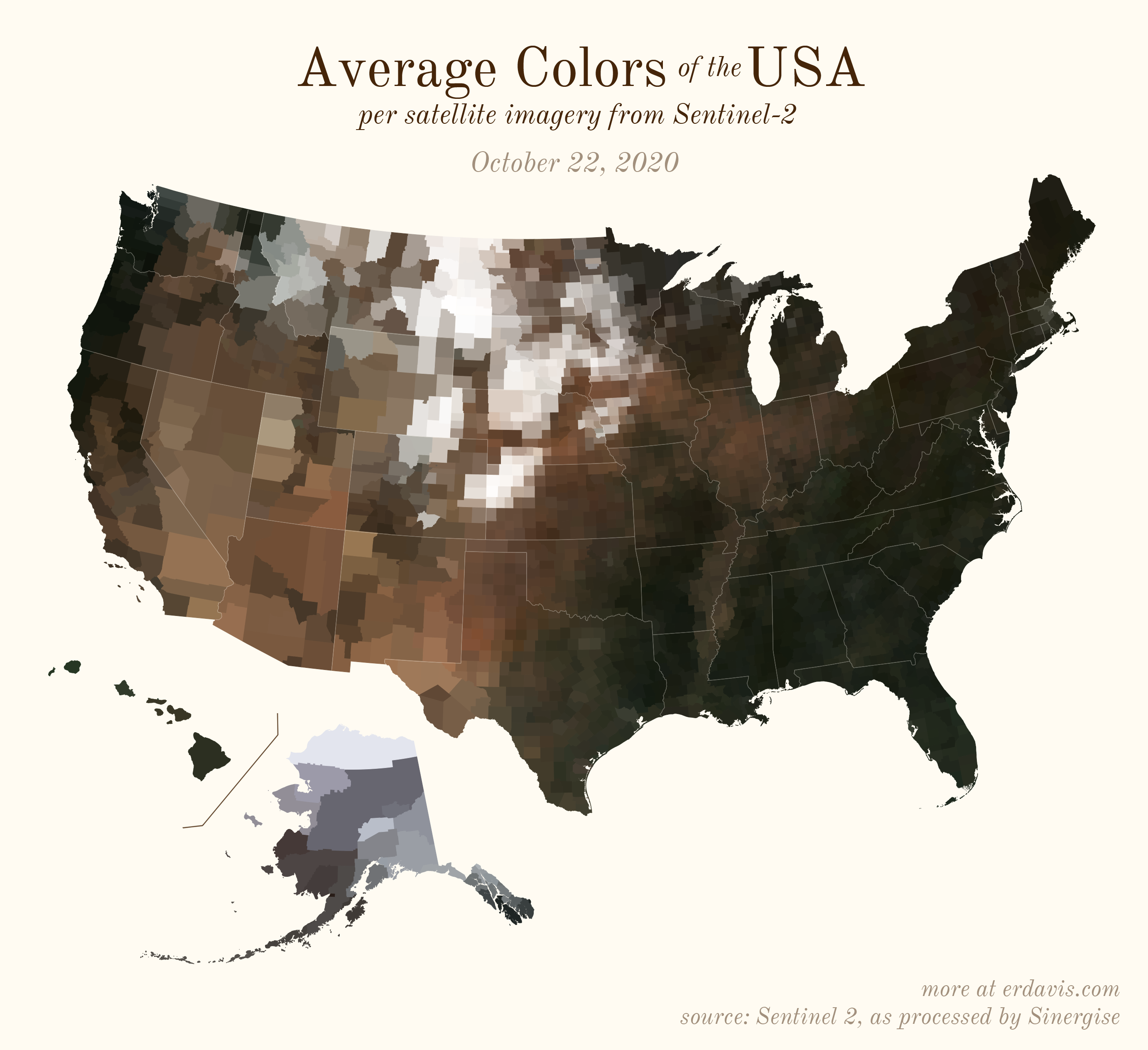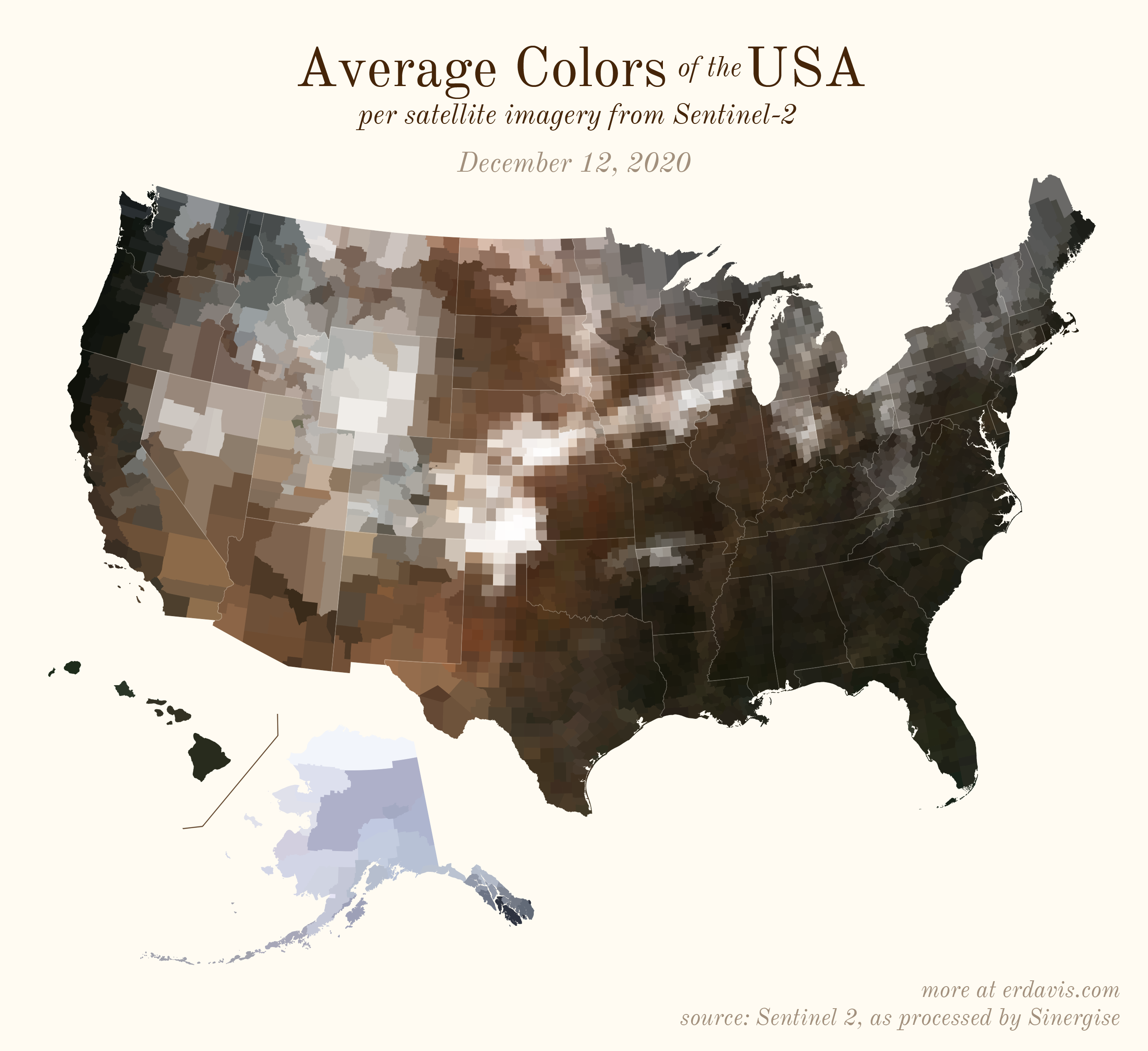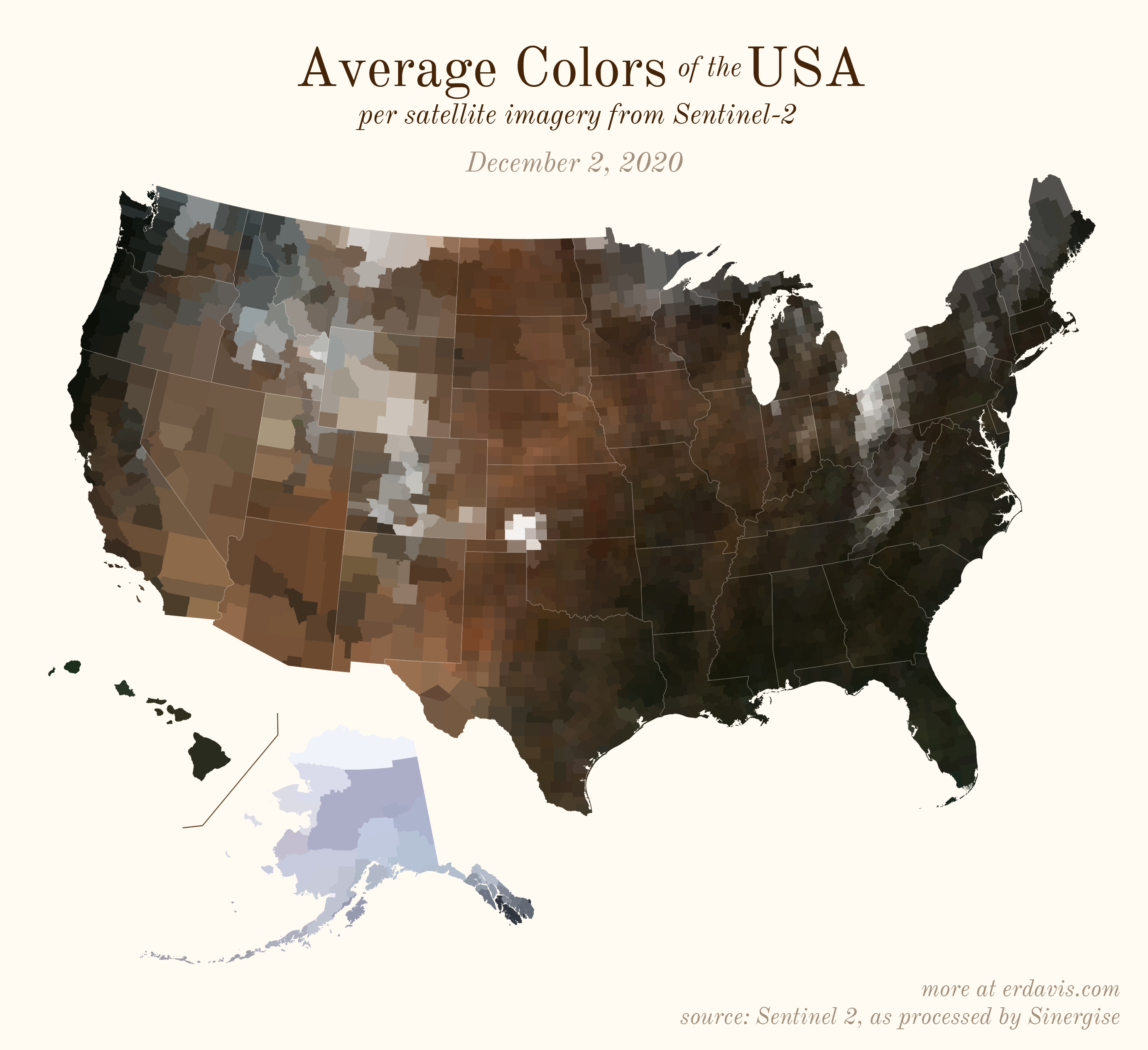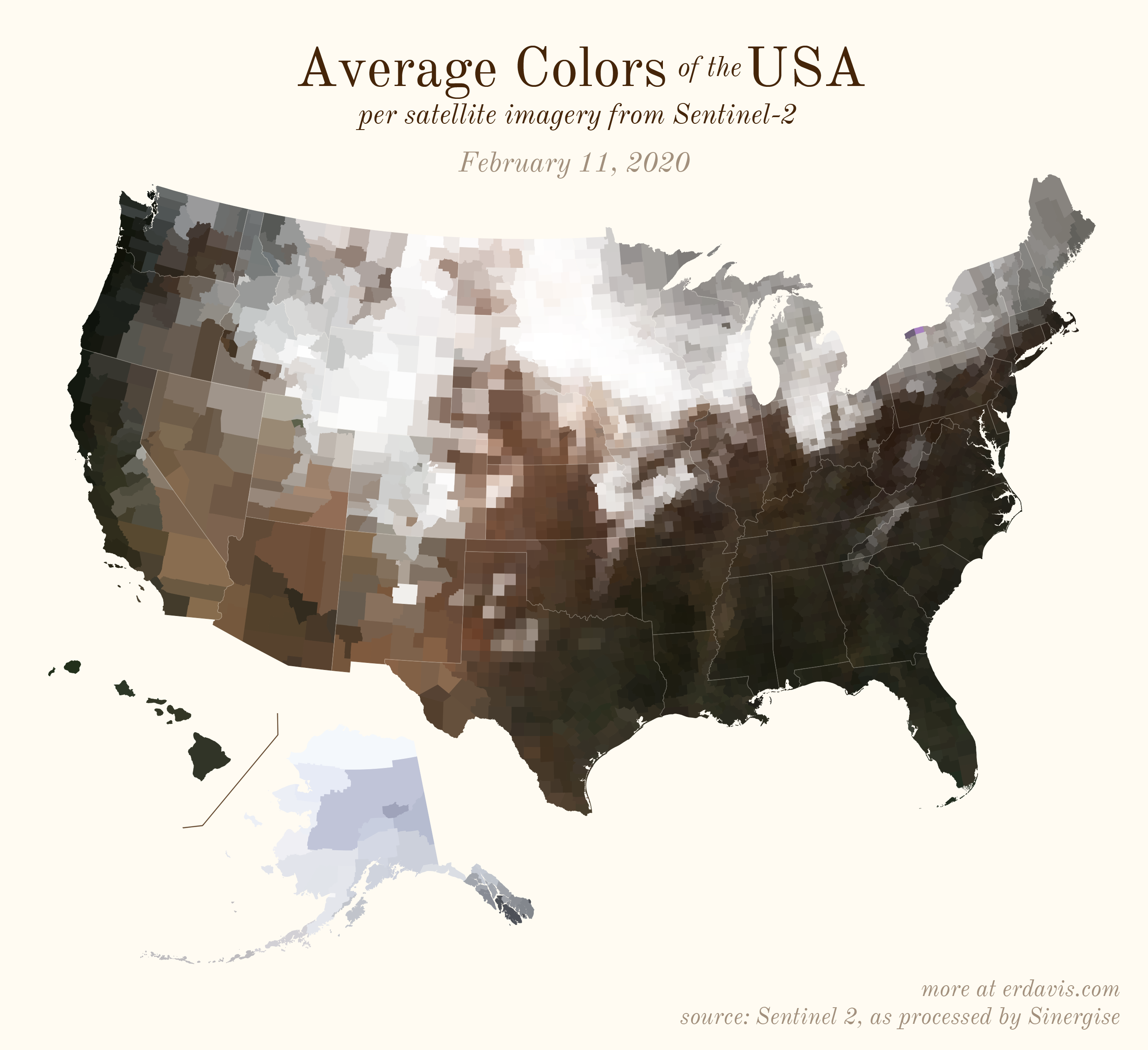 […] the first day of 2020 (as derived from Sentinel 2 satellite imagery). If you visit Erin's post the Average Seasonal Color of the USA you can view 35 other maps showing how the average colors of the USA change over the course of the […]