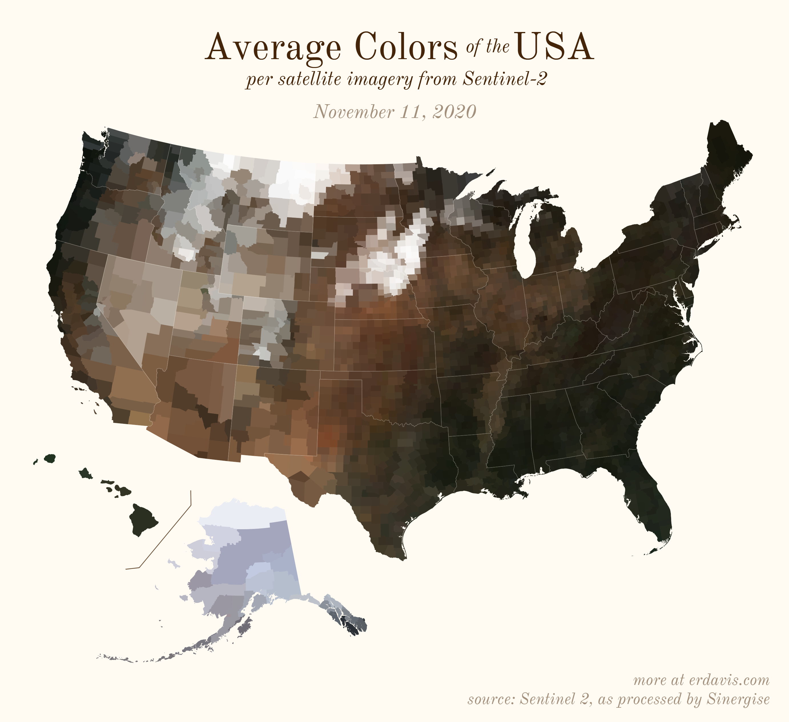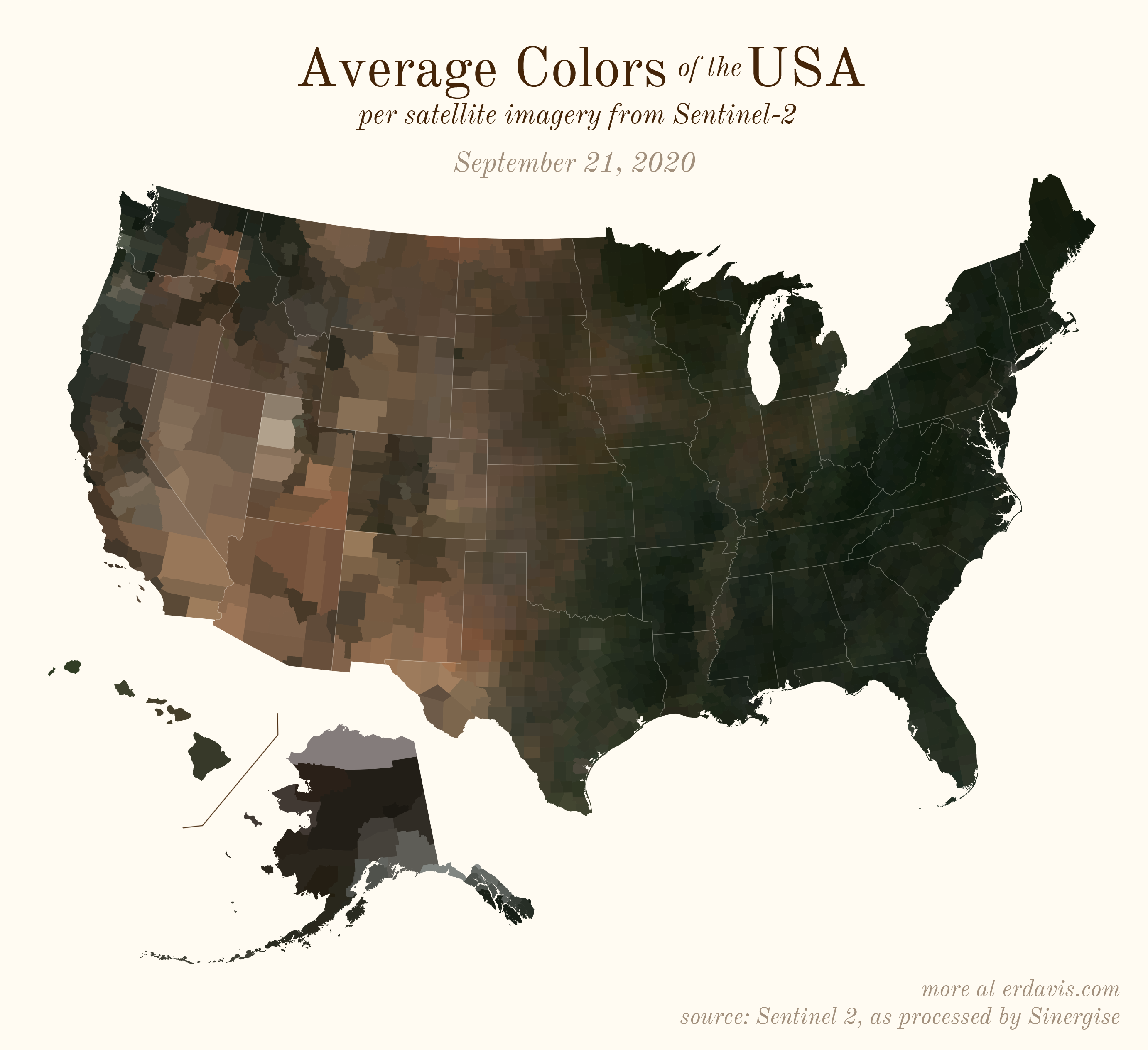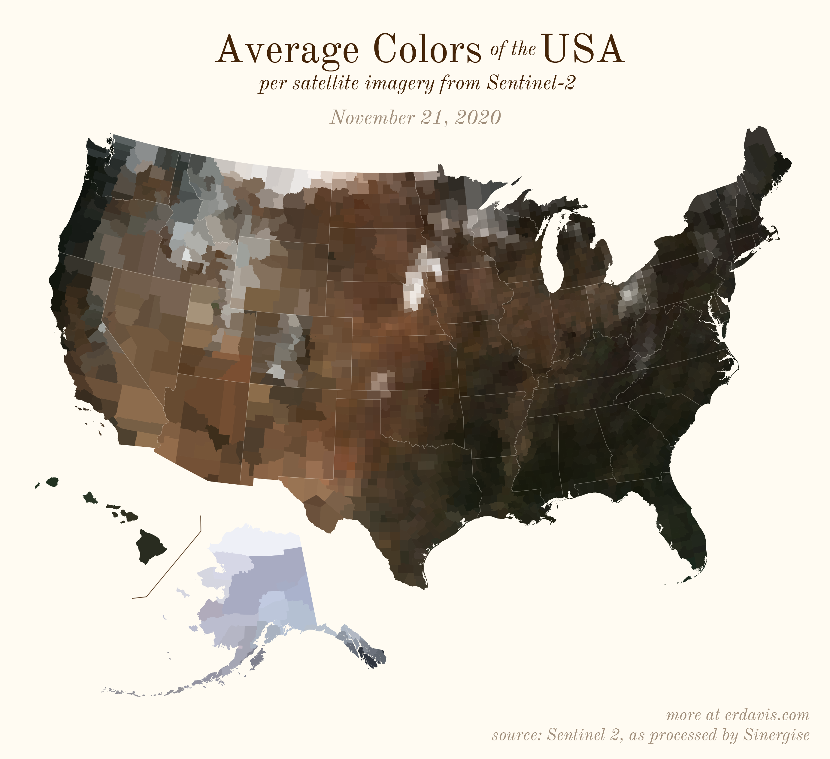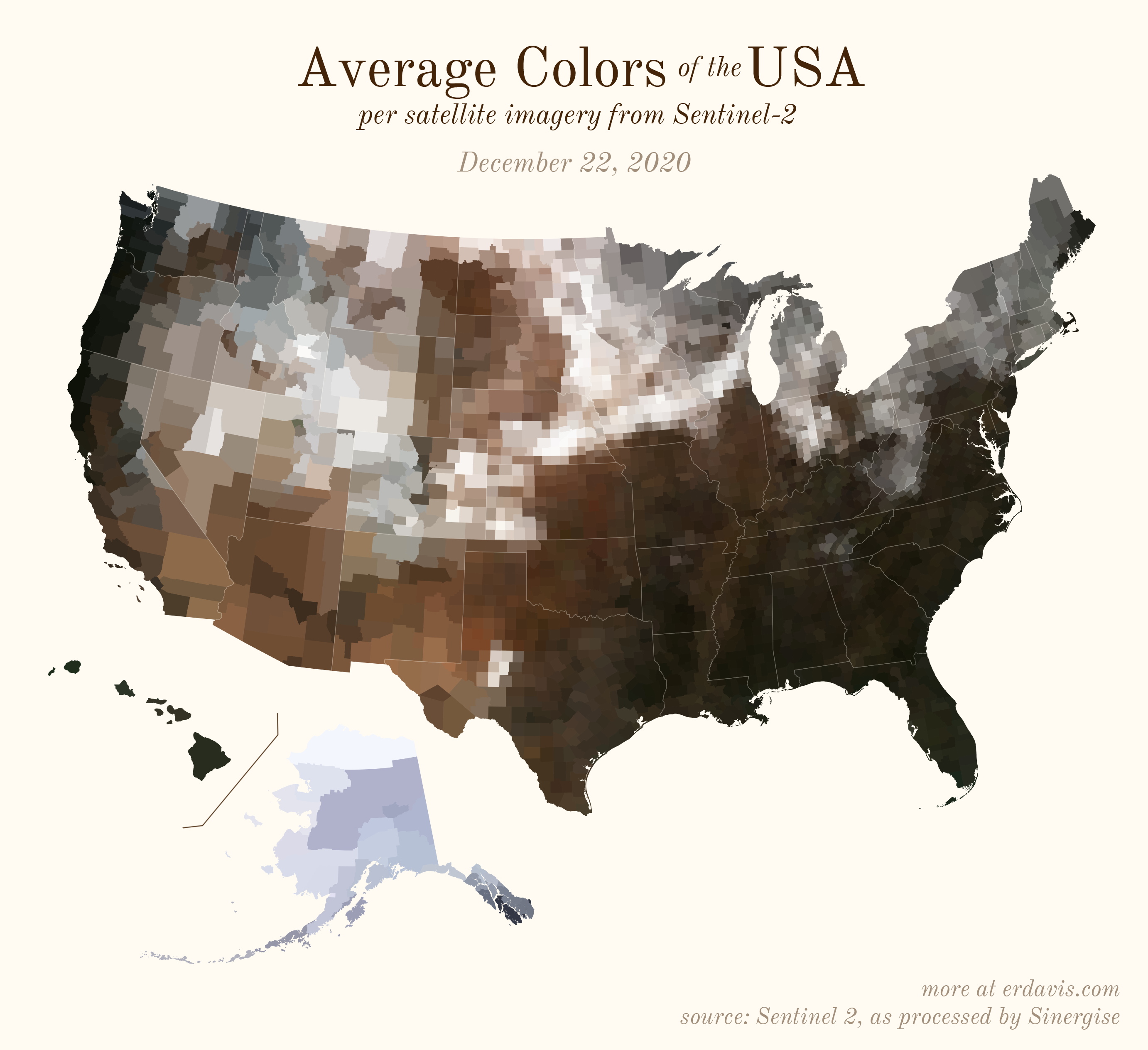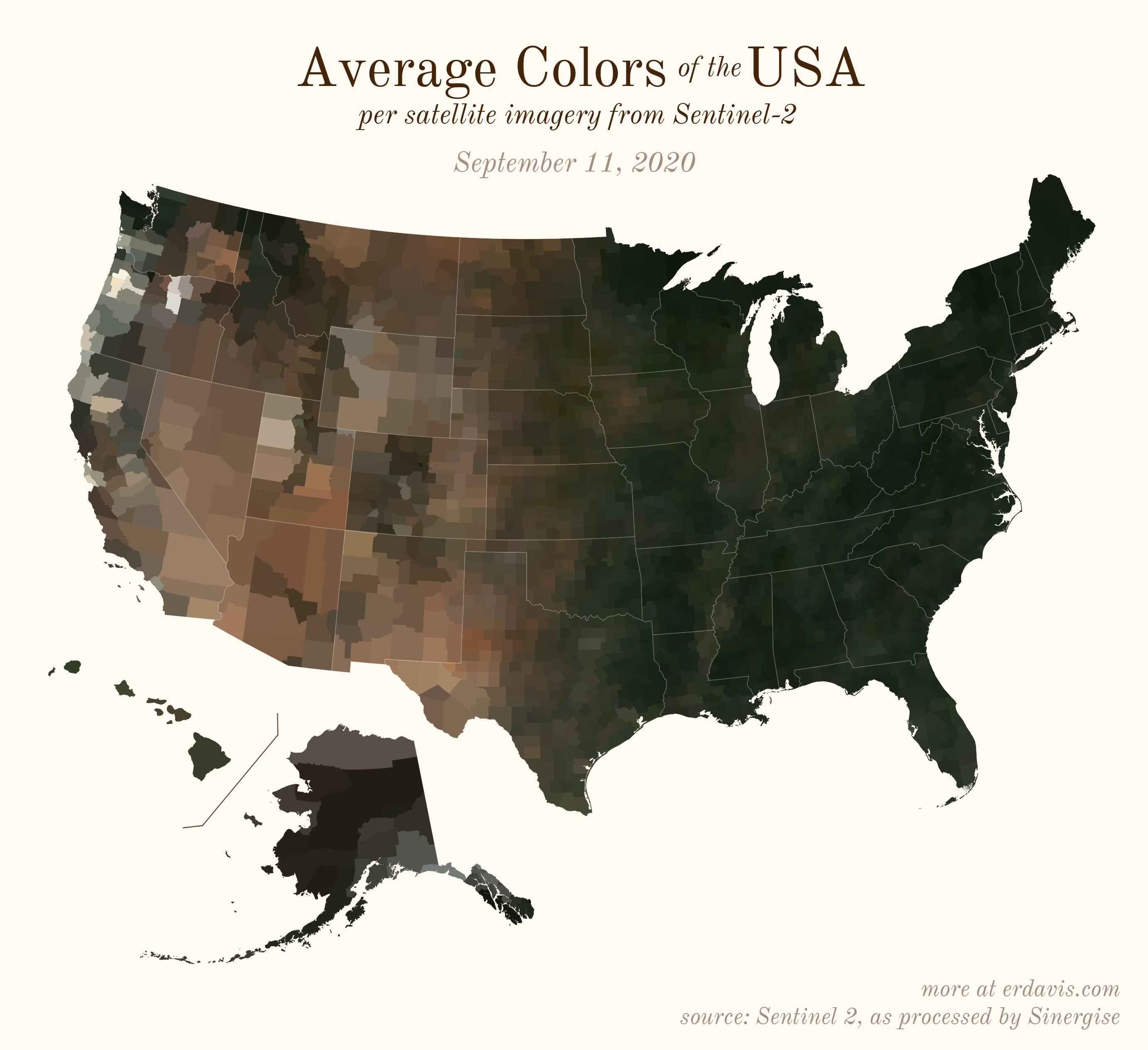 […] the first day of 2020 (as derived from Sentinel 2 satellite imagery). If you visit Erin's post the Average Seasonal Color of the USA you can view 35 other maps showing how the average colors of the USA change over the course of the […]
