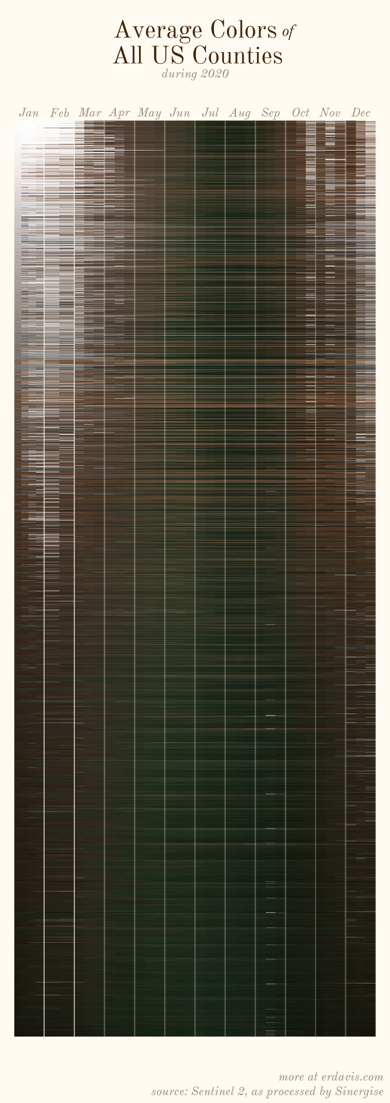 […] you can see a snapshot of the average colors of all U.S. counties as of January 1, 2020. Visit Erin’s blog to observe their change during the last year, in a slideshow or in an animated GIF. Enjoy a […]