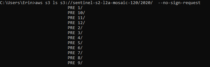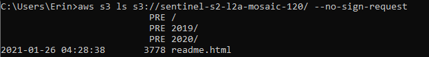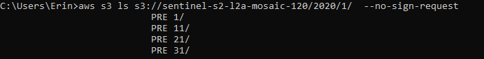 aws s3 ls s3://sentinel-s2-l2a-mosaic-120/2020/1/ --no-sign-request