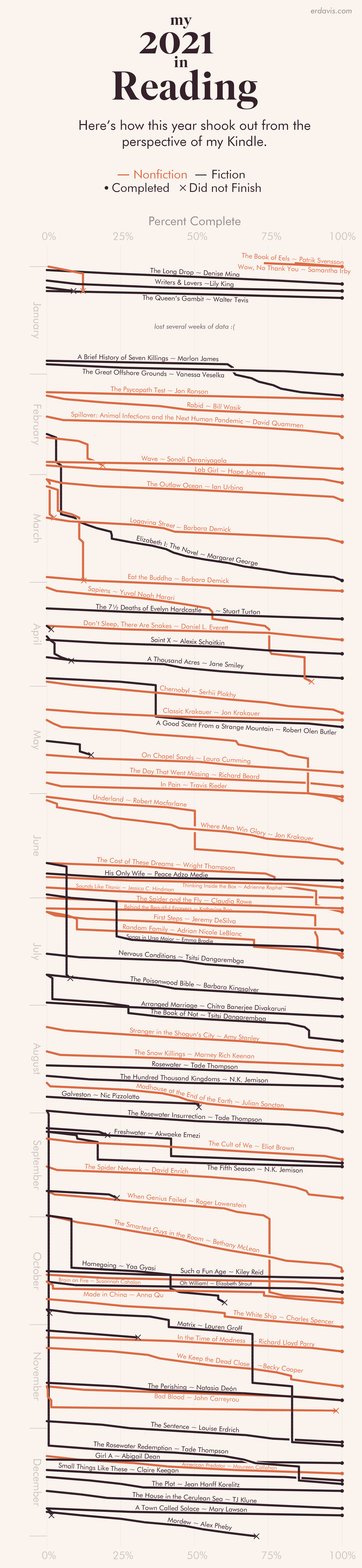 And just like that, another year is gone. As in 2020, I spent 2021 carefully logging my reading on my Kindle to visualize at year-end.