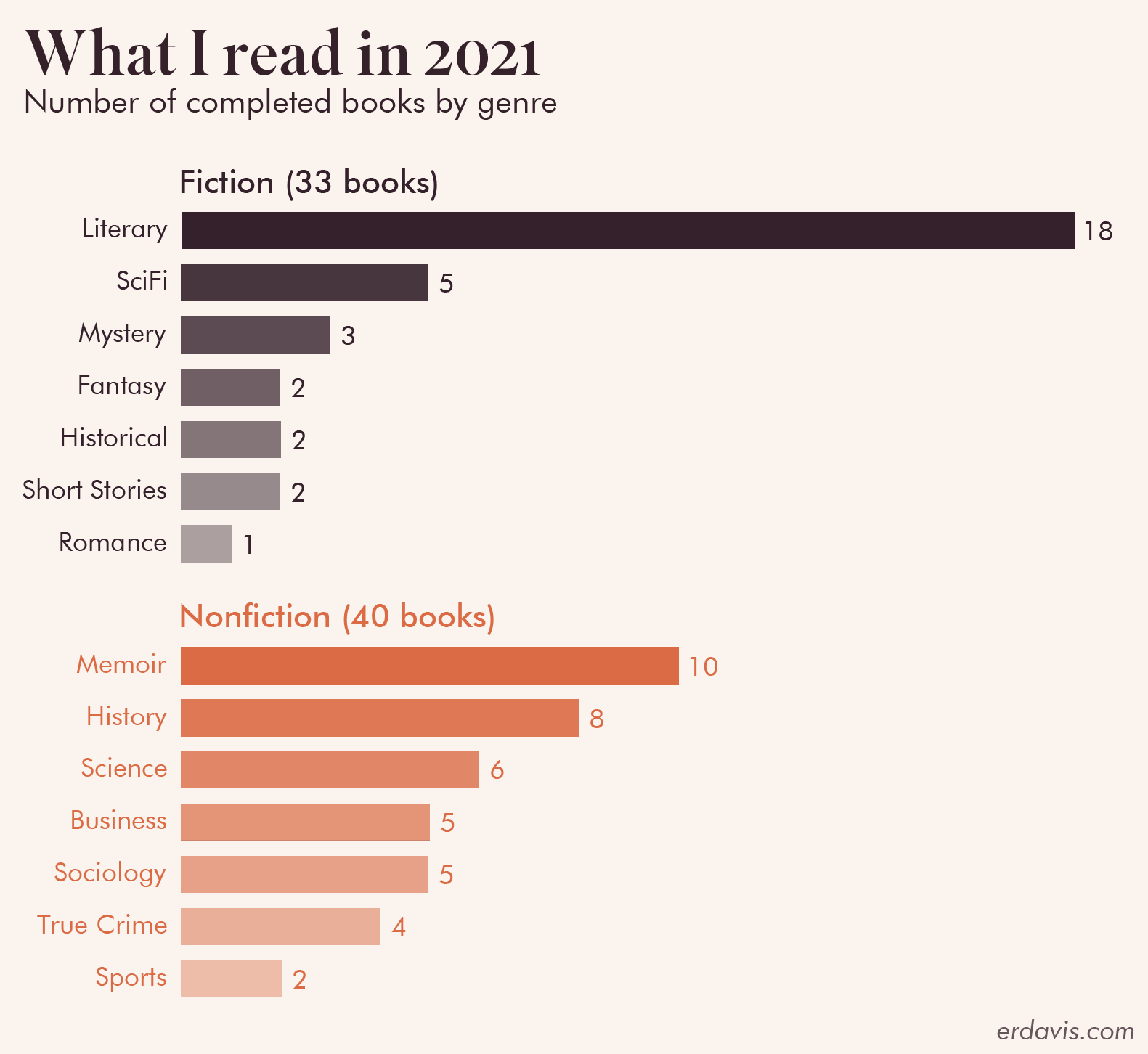 More nonfiction than fiction, which doesn’t surprise me. I don’t understand the reputation that nonfiction has as being “hard” or somehow more “enriching” than fiction. Fiction requires emotional energy to invest in the story, and when I’m exhausted nonfiction goes down a lot smoother.
