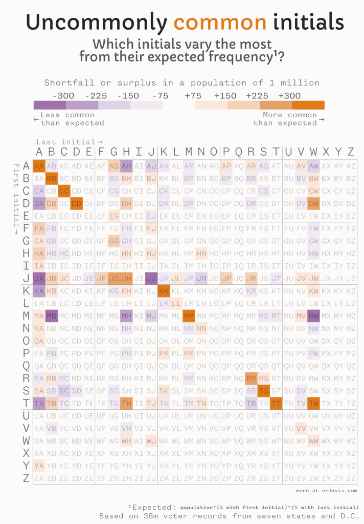 - Use a warm color for “more common than expected” and a cool color for “less common” instead of the opposite way around. The red really captures your attention, so I feel it should be used to indicate unusually common initials (the point of the visual)