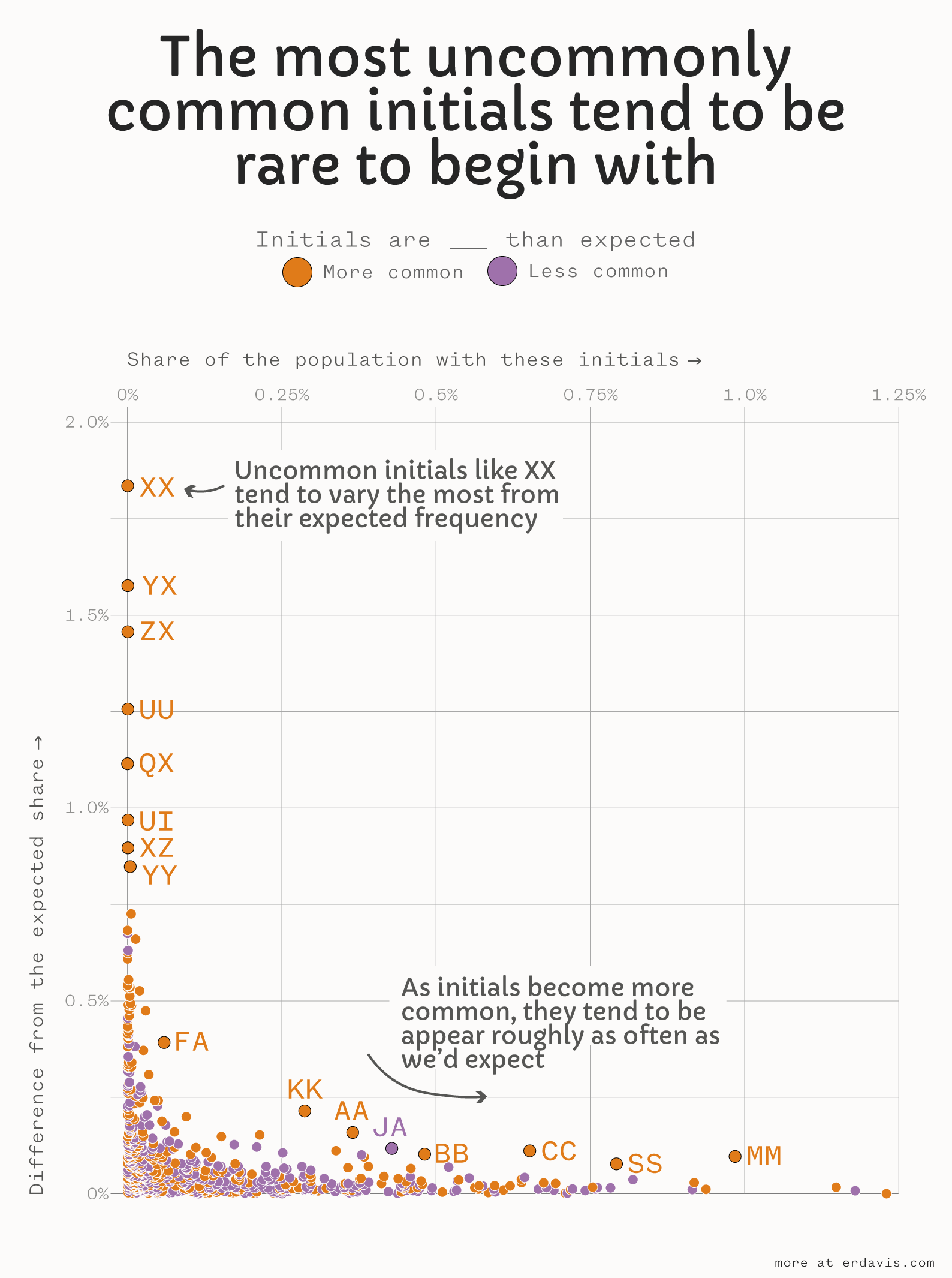 I charted frequency versus deviation from expected and found a very clear pattern. The most variable initials are indeed quite rare: