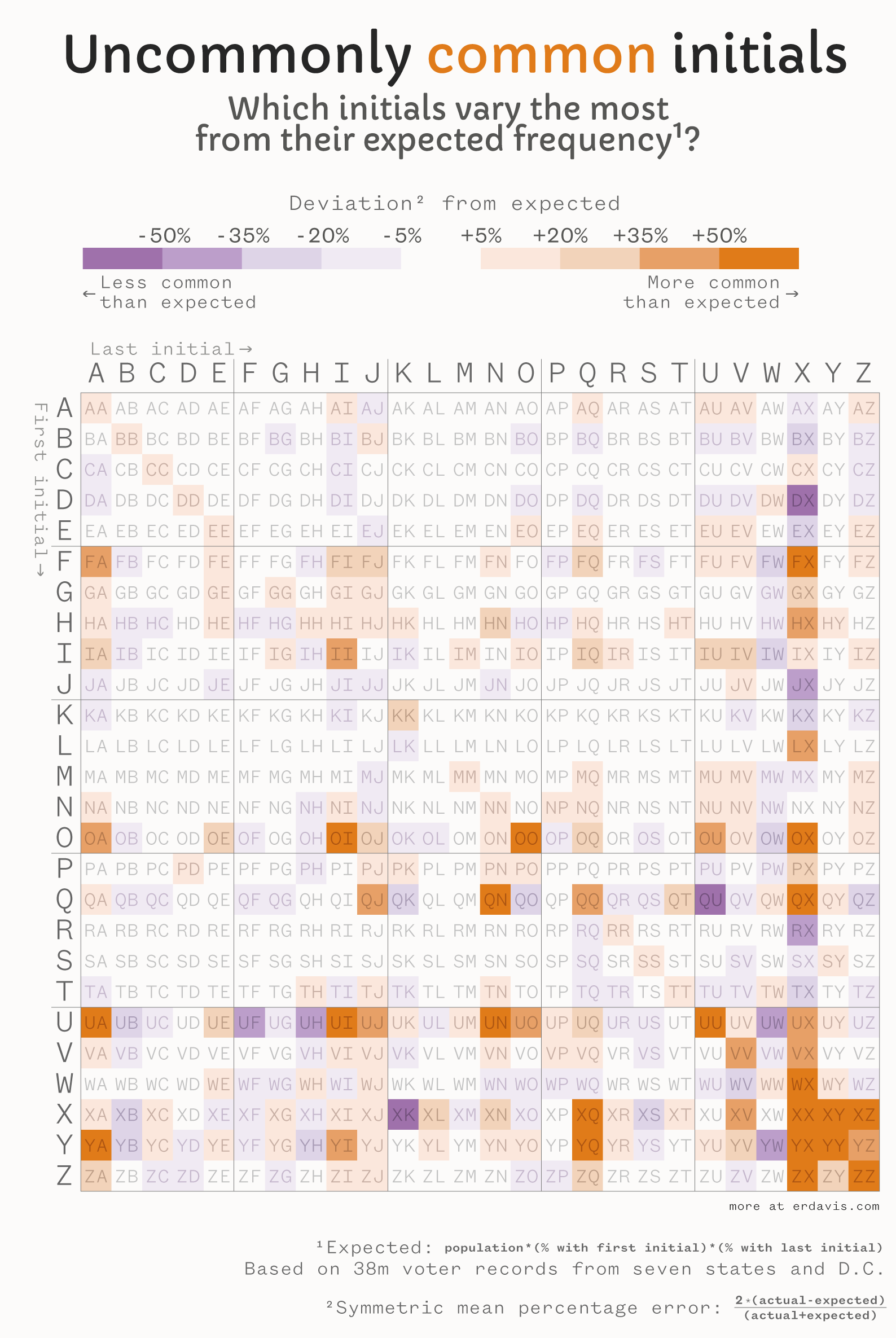 - Use a warm color for “more common than expected” and a cool color for “less common” instead of the opposite way around. The red really captures your attention, so I feel it should be used to indicate unusually common initials (the point of the visual)