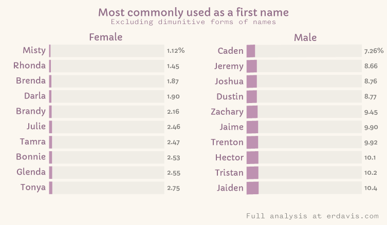 What stood out to me in this chart wasn’t the most “middle” names, but the most “first” ones. Almost all of them are dimunitives of other names, like Tammy for Tamara.