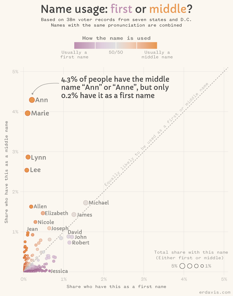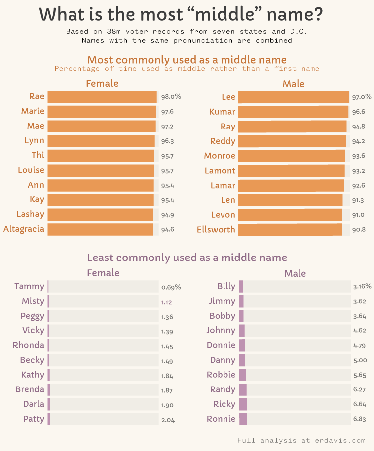 It was easy to calculate the first-to-middle ratio for each specific name. I naively figured this’d show me the most “middle” names, but the results were messy and I had to work out… what even is a middle name?